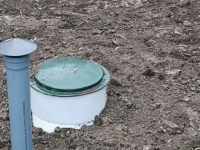 Przydomowa biologiczna oczyszczalnia ścieków EKO BIO 2500 dla 5 osób z pompą na wypływie i odprowadzeniem do poletka drenażowego w nasypie. Inwestycja przeprowadzona w województwie podkarpackim, w powiecie rzeszowskim, w gminie Świlcza, w miejscowości Mrowla.