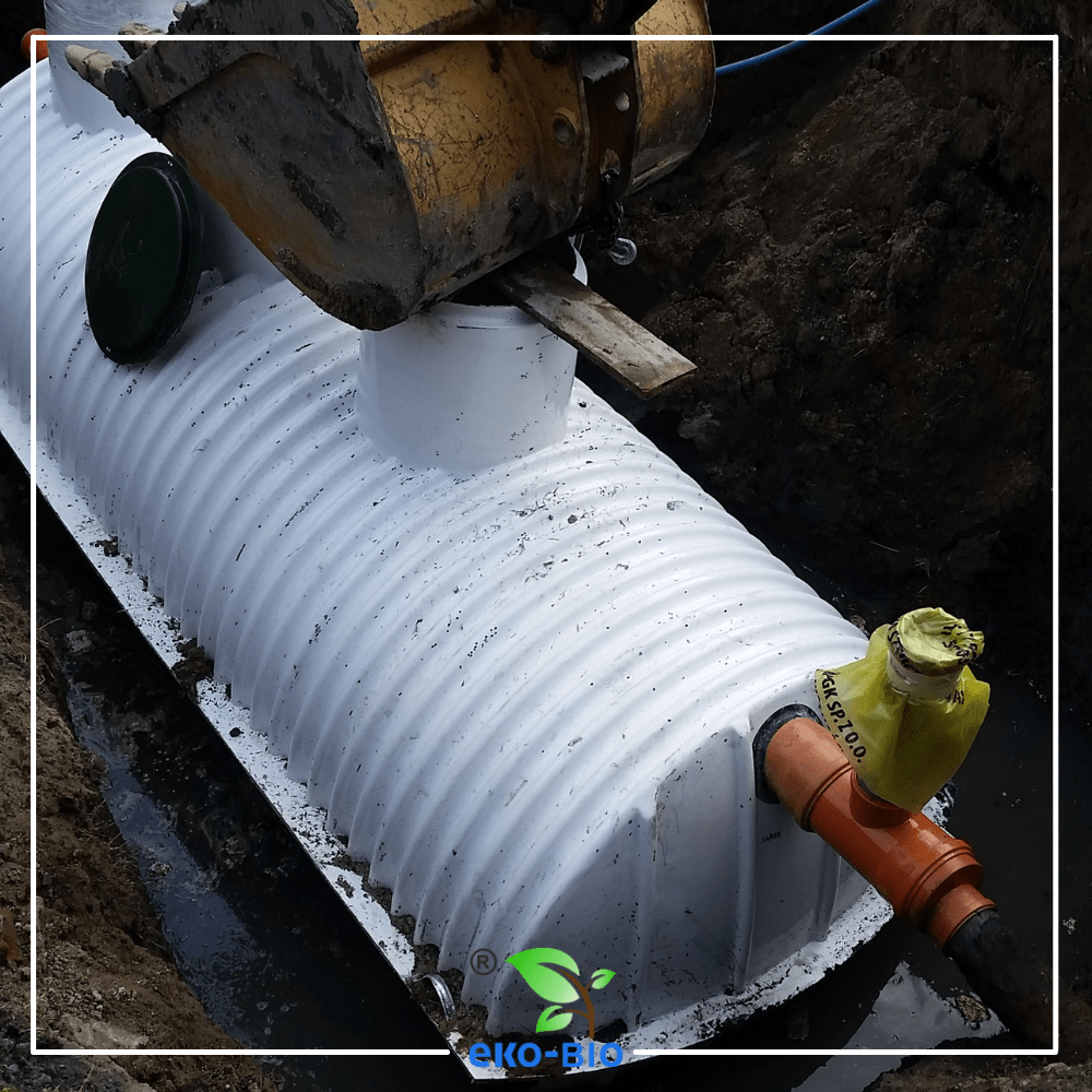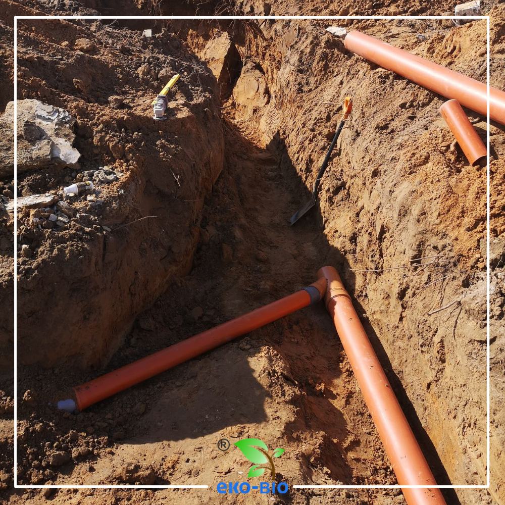 Przydomowa biologiczna oczyszczalnia ścieków EKO BIO 2500 dla 5 osób z przepompownią i odprowadzeniem oczyszczonego ścieku do zbiornika szczelnego EKO. Inwestycja przeprowadzona w województwie podkarpackim, w powiecie kolbuszowskim, gminie Kolbuszowa.