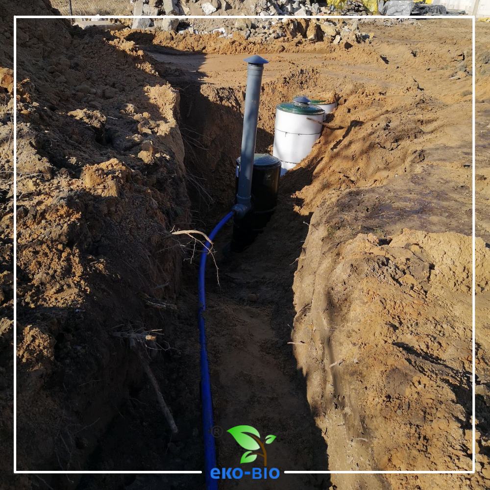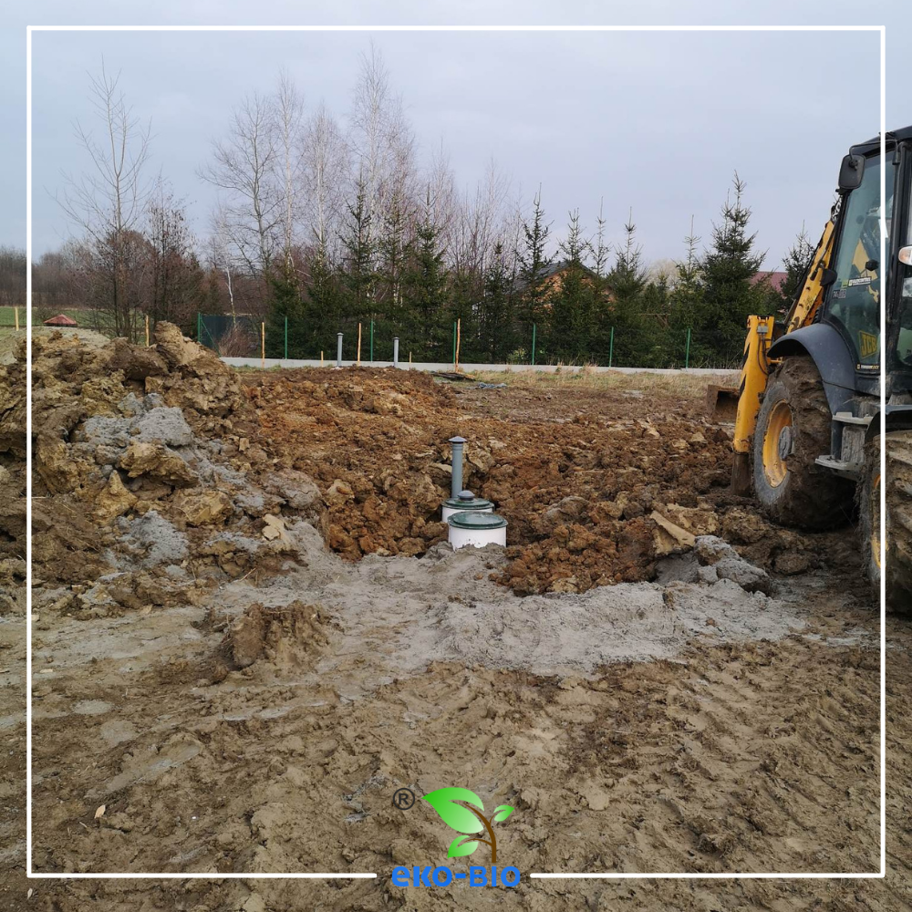 Przydomowa biologiczna oczyszczalnia ścieków EKO BIO 4000 dla 10 osób z przepompownią i odprowadzeniem oczyszczonego ścieku do drenażu rozsączającego w nasypie. Inwestycja przeprowadzona w województwie świętokrzyskim, powiecie ostrowieckim, gminie Bodzechów, w miejscowości Wólka Bodzechowska.