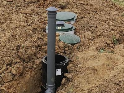 Przydomowa biologiczna oczyszczalnia ścieków EKO BIO 2500 dla 5 osób z przepompownią i odprowadzeniem oczyszczonego ścieku do poletka drenażowego w nasypie. Inwestycja przeprowadzona w województwie podkarpackim, powiecie rzeszowskim, gminie Krasne, w miejscowości Malwa.